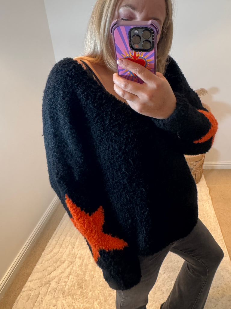Star Sleeve Popcorn Knit Jumper | Black/Orange
