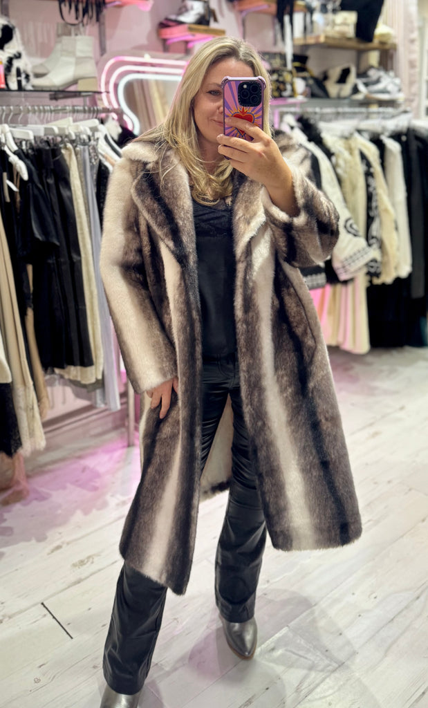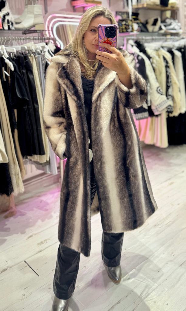 There are almost no words for this beautiful coat - in sumptuous ombre faux fur in black, brown and cream, it's a real show stopper of a coat. It also has a real old school, Hollywood glamour style to it - completely timeless.