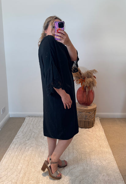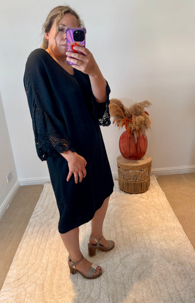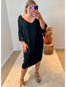 Your holiday best friend! This great dress can be worn as a cover up over swimwear or a dress in its own right - style it your way. It features 3/4 sleeves with pretty crochet detail, a wide V-neck (can be worn off the shoulder) and a stunning crochet design on the back - the perfect way to show off your tan!