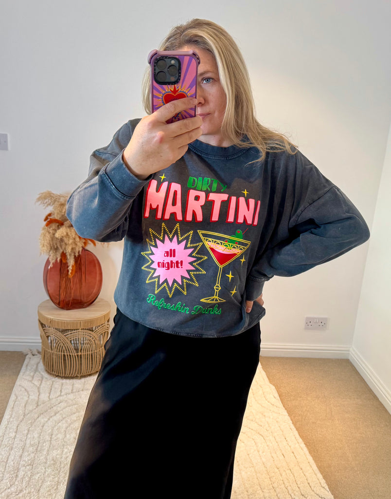 Shake up your casual wardrobe with this cheeky Dirty Martini Retro Print Sweatshirt. Featuring a fun, vintage-inspired graphic that celebrates cocktail culture, this charcoal grey sweatshirt brings retro vibes and personality to everyday wear. The distressed finish adds authentic character and a lived-in edge, making it perfect for those who love quirky, nostalgic style. Cosy, comfortable, and conversation-starting—ideal for laid-back days when you want to show off your fun side. A great gift for someone too!