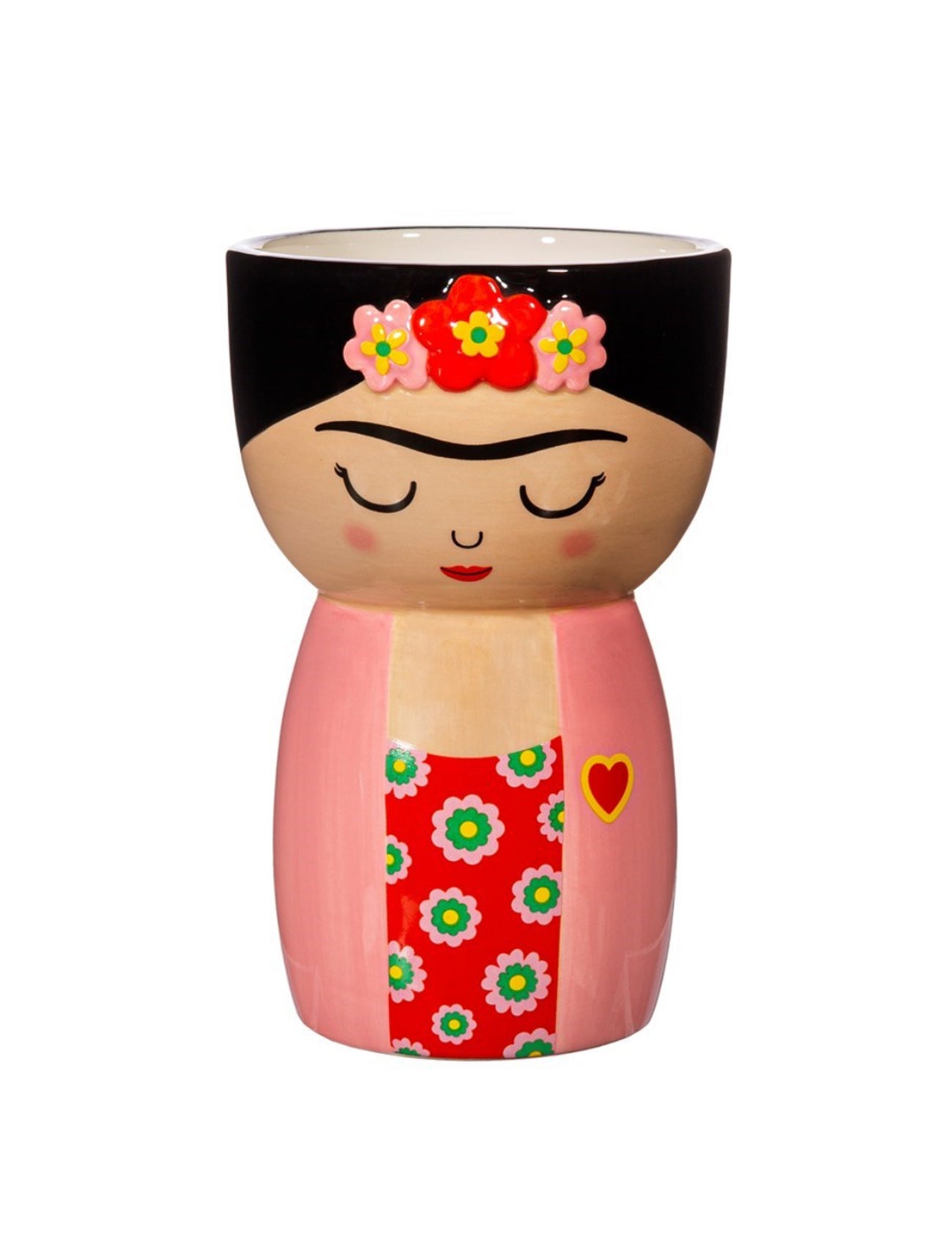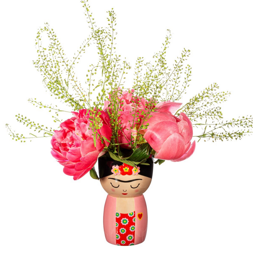 Display your beautiful blooms alongside the icon of who is Frida Kahlo. Featuring a vibrant colourway of red, pink, green and yellow, this vase is small in size and showcases the beauty of Frida and her artwork.