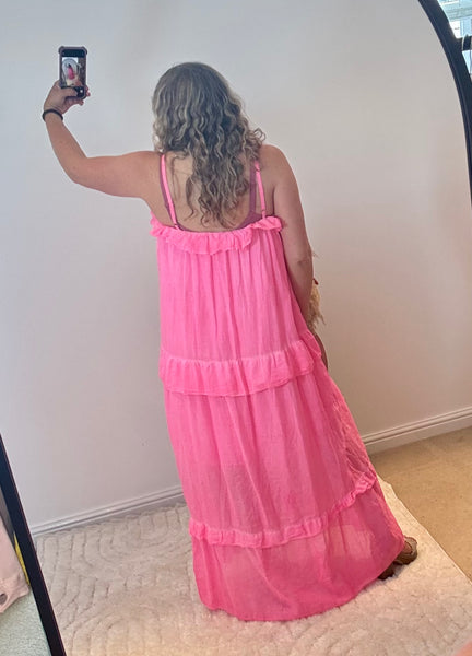 Frill Detail Layered Cotton Maxi Dress | Neon Pink