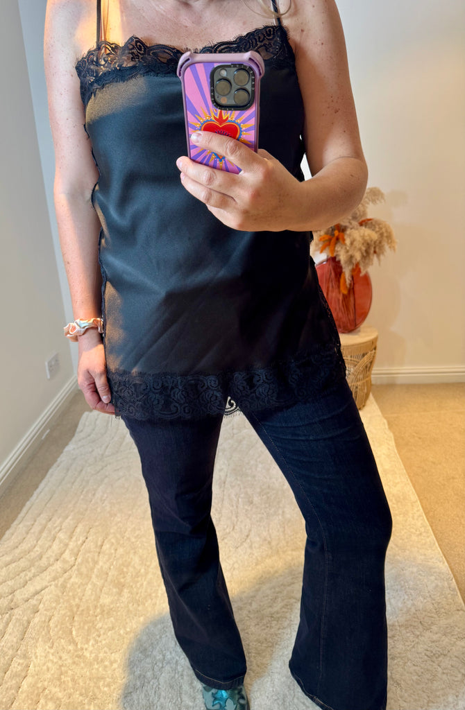 A new addition to our silky camisole collection, this lovely style has a longer length and features wide bands of pretty lace along the neckline, hemline and down each side. Perfect if you prefer a longer length with a pair of jeans or bodycon skirt.
