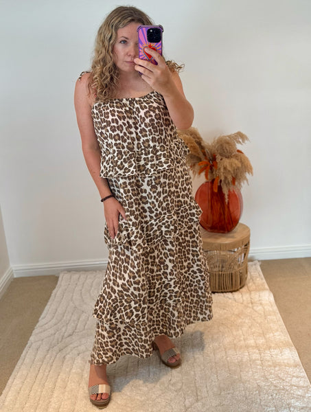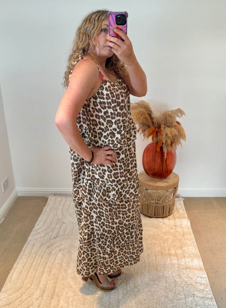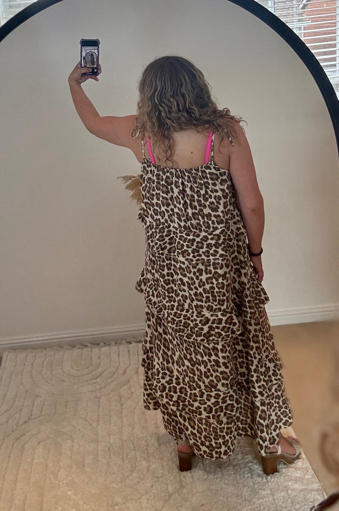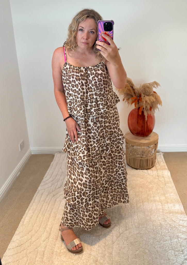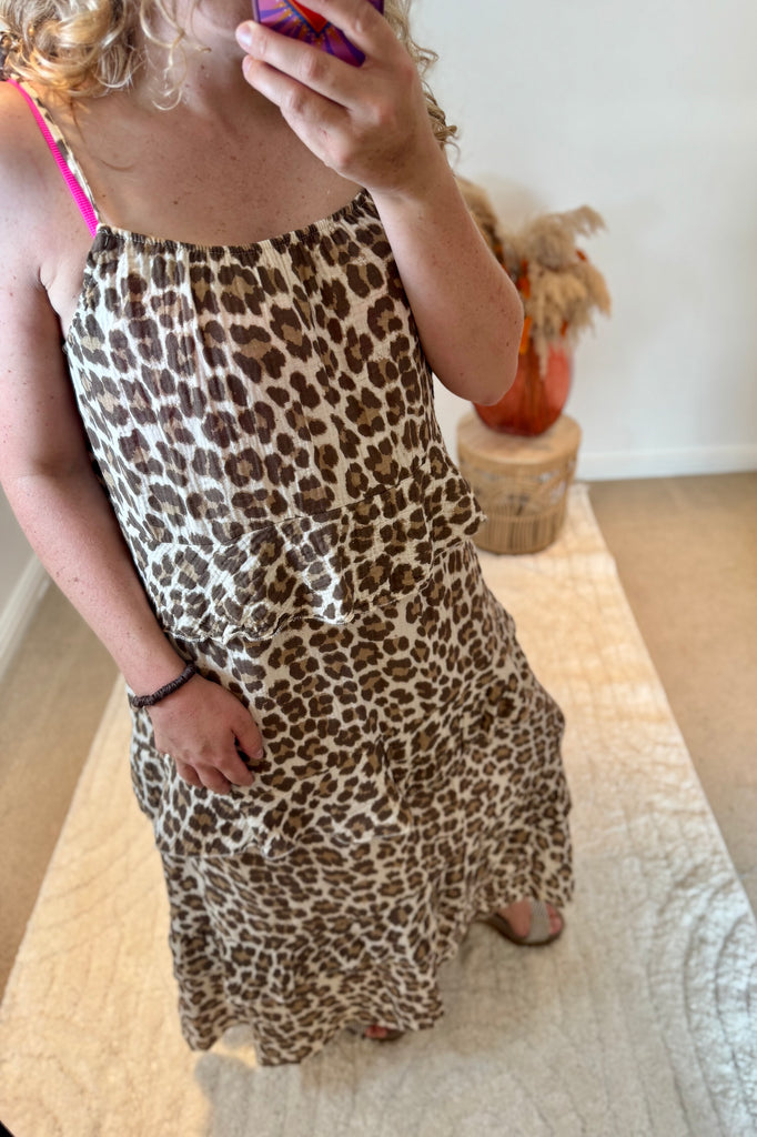 In ever popular leopard print, this dress has real wow factor! Made from soft cotton cheesecloth, this dress features cami straps and really pretty tiered layers, creating a lovely floaty effect.