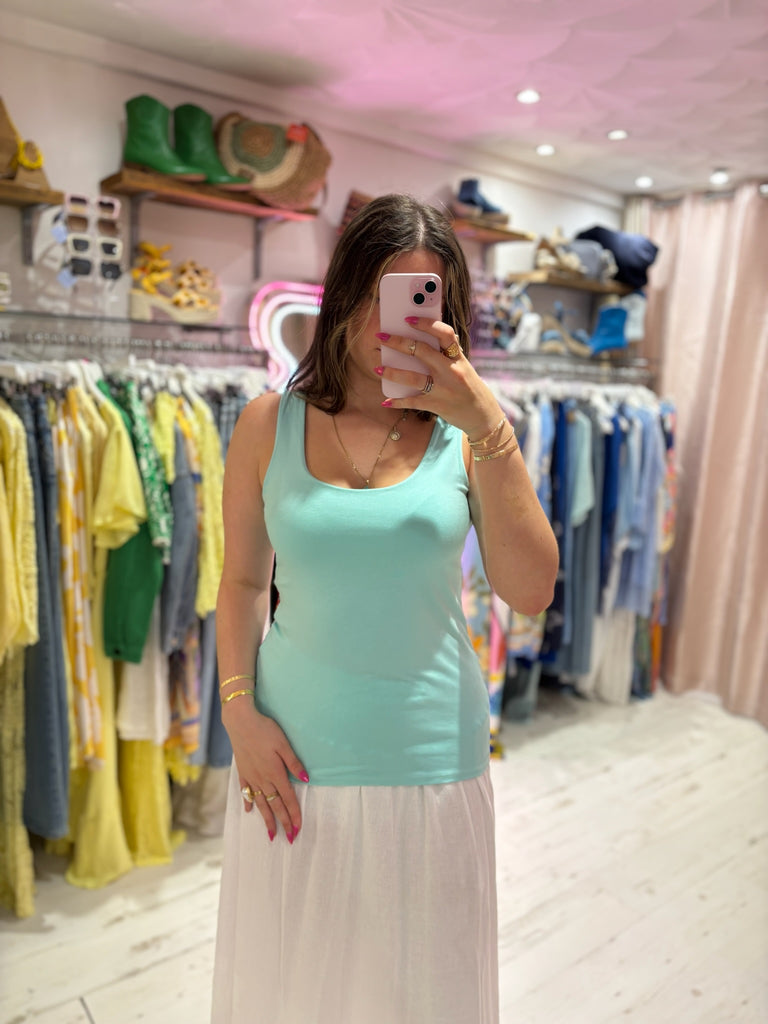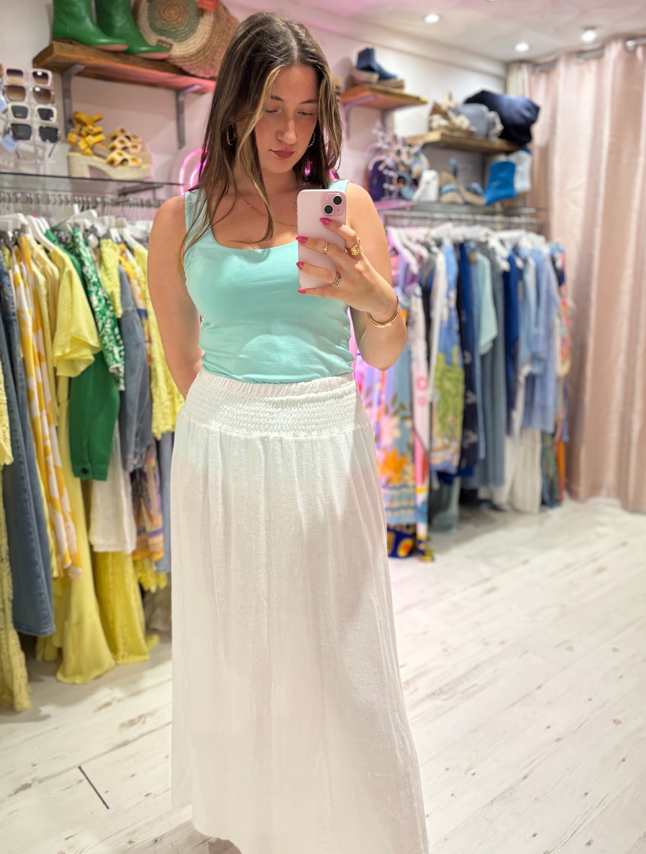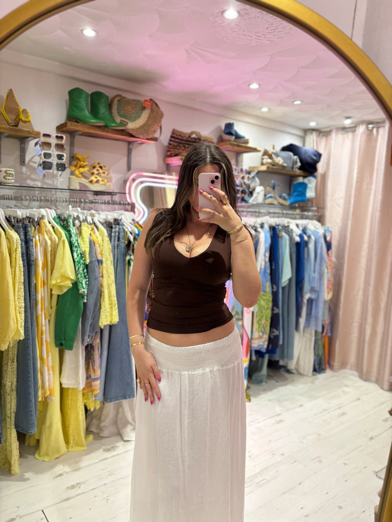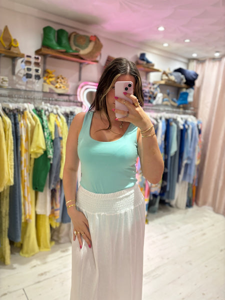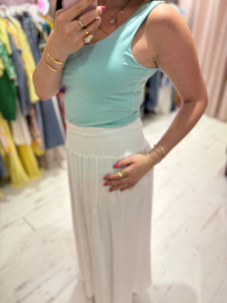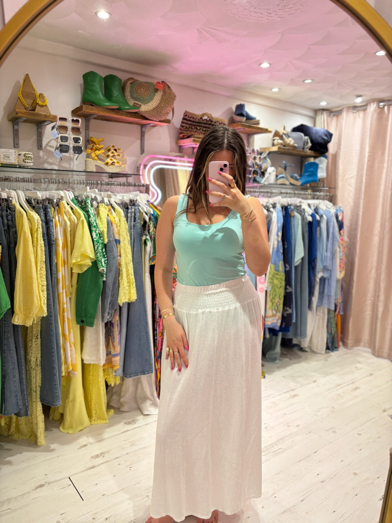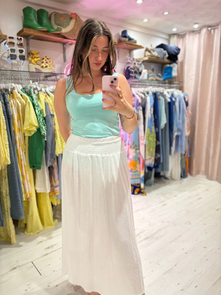One of the shapes of the season, this "tea bag" style midi skirt gives stylish, effortless vibes for Summer. In a textured cotton/linen mix fabric with a wide, shirred elastic waistband, making it both super flattering and comfortable.