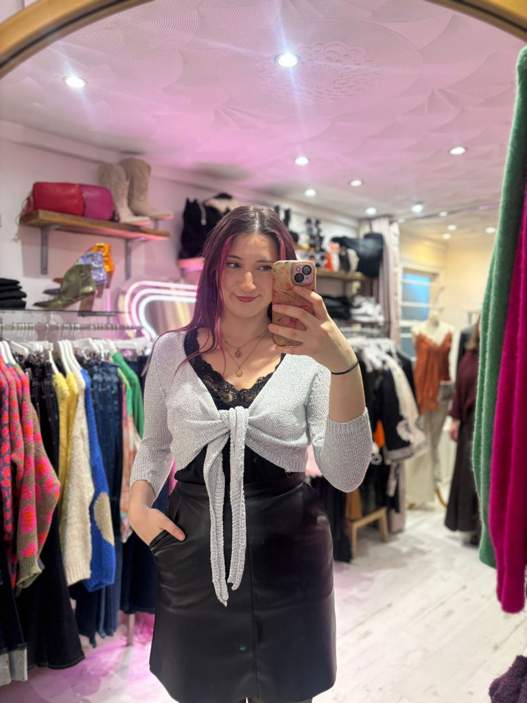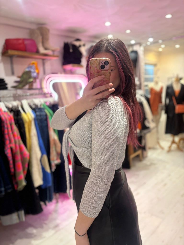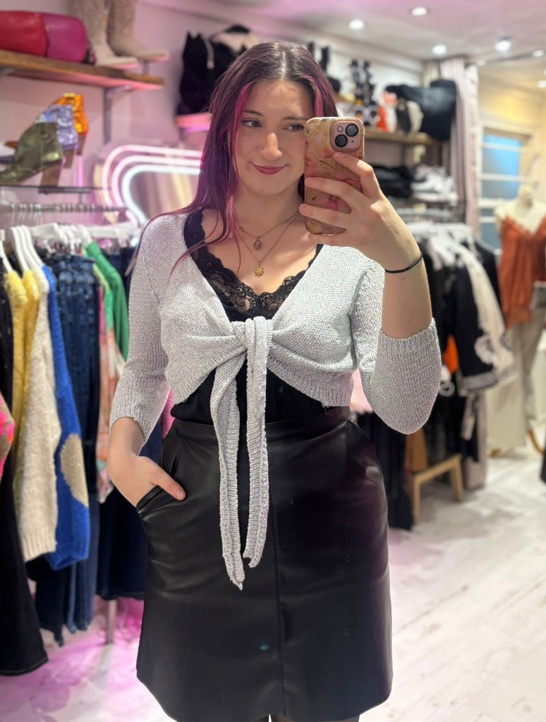 Metallic Knit Tie Front Cardigan | Silver