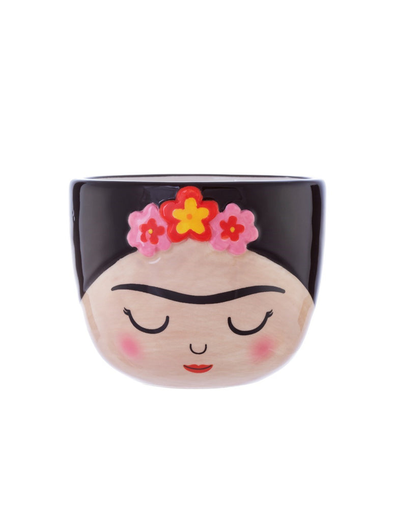 Your friends will envy your indoor garden even more with this charming mini planter, featuring our vibrant Frida with blushing cheeks, fluttery lashes and a garland of pretty flowers in her black hair. A small but impactful addition to your plant corner.