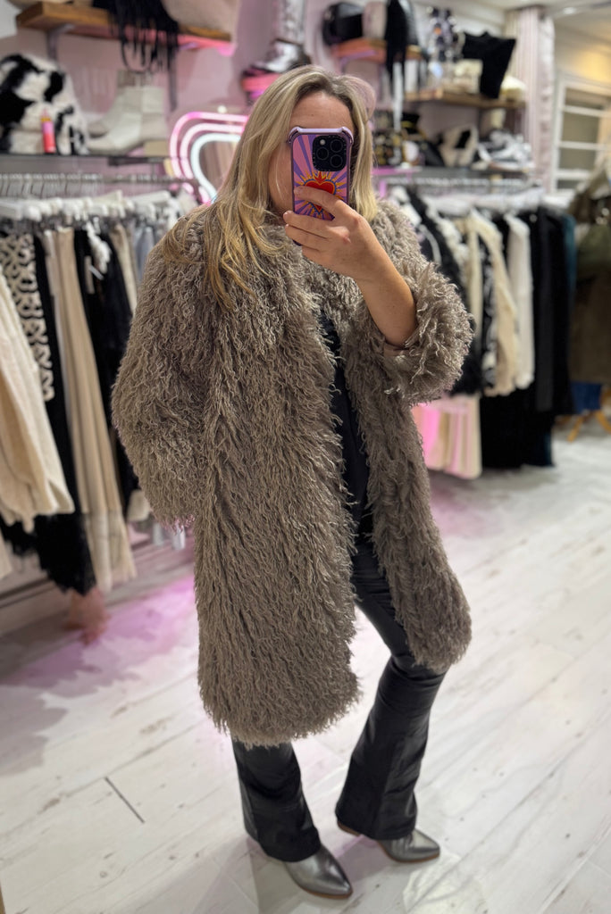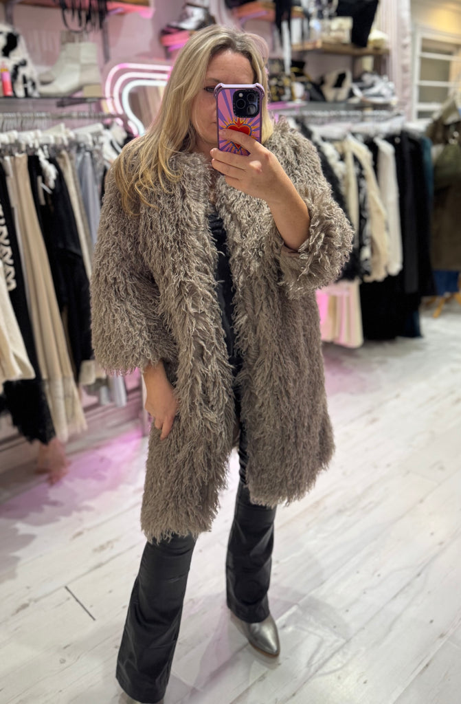 Mongolian Style Faux Fur Long Smart Coat | Taupe