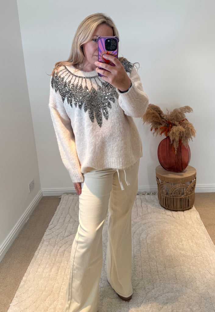 Sequin Feather Detail Jumper | Cream