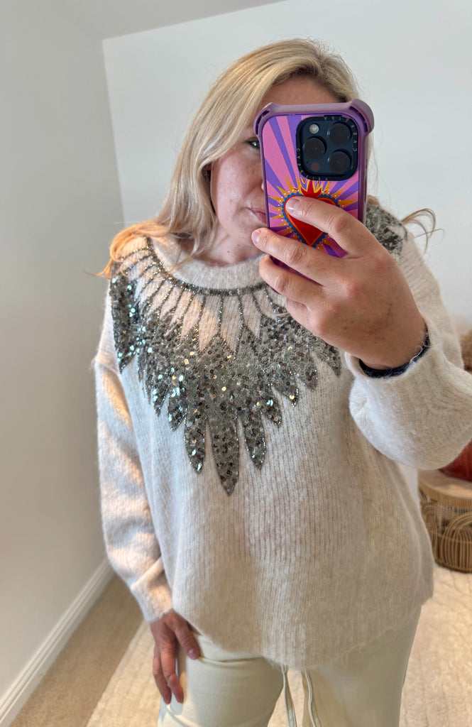 Elevate your winter wardrobe with this stunning cream jumper that demands attention. Luxurious mohair mix knit feels incredibly soft and warm, whilst the captivating sequin and feather neckline detail transforms any outfit into something truly special. This is the piece you'll reach for again and again—whether you're making an entrance at a festive celebration or enjoying quiet moments by the fire. The shimmering embellishment catches every light, ensuring you look effortlessly polished and put-together. Invest in a jumper that delivers both comfort and undeniable style, the perfect addition to any discerning wardrobe this season.