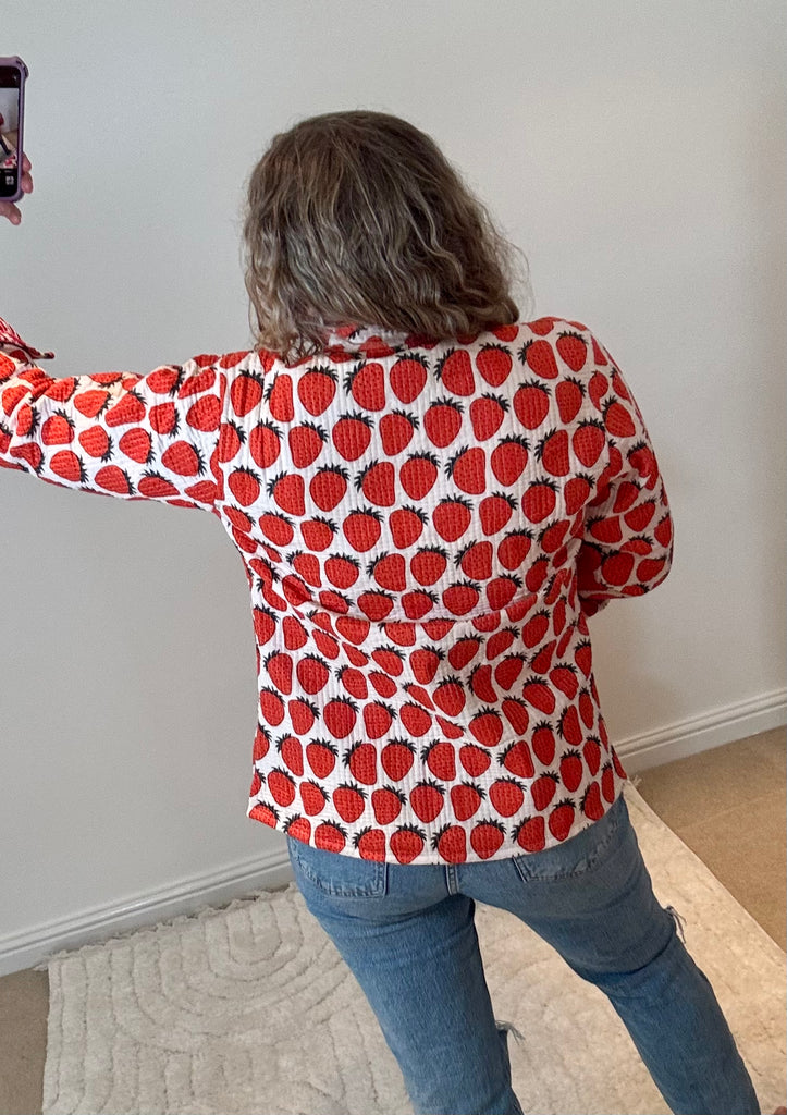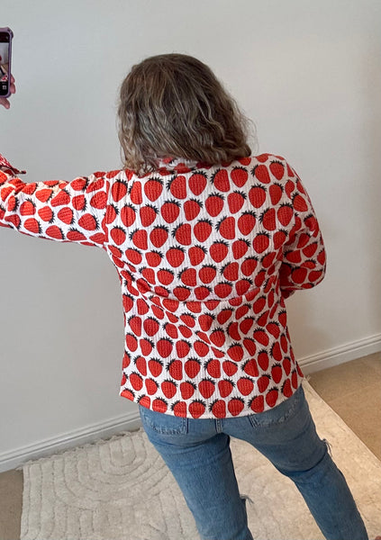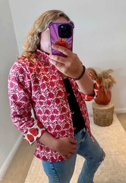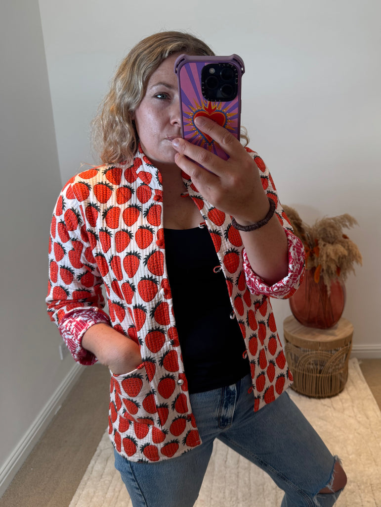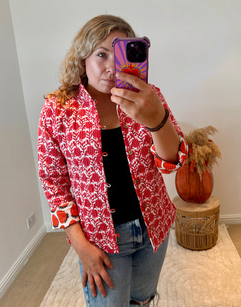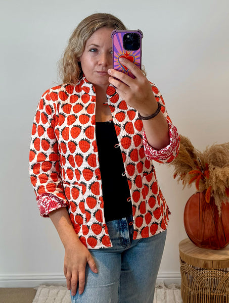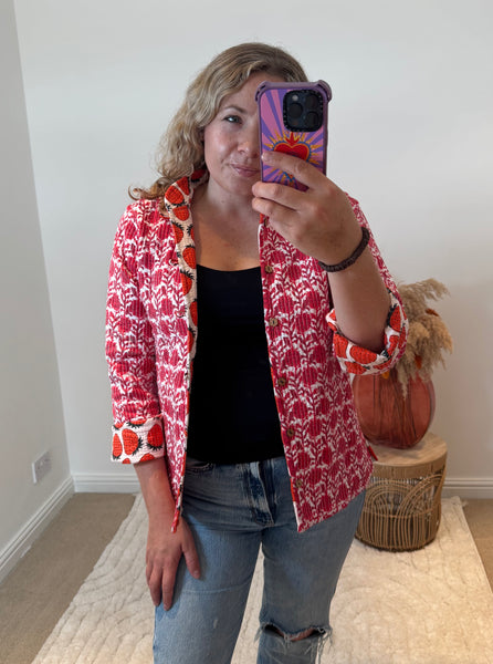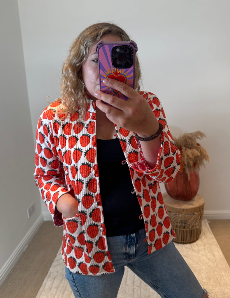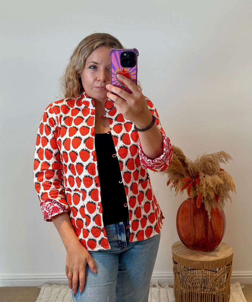 These amazing jackets are bound to put a smile on your face - and certainly make the prospect of going into Autumn feel a little less sad! In a lightweight, quilted cotton - the main side features a pretty strawberry print with patch pockets and fabric covered buttons. Then, if you fancy a change, simply turn it inside out and you have a boho red floral print on the other side with wooden buttons. The sleeves look great rolled up to reveal a glimpse of the reverse print. Wear with a simple tee and jeans or over a dress - we love this so much here at Pink Flamingo!