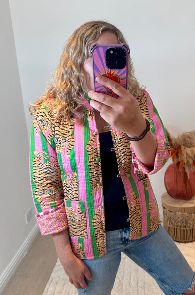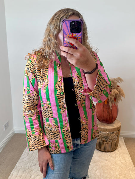 These amazing jackets are bound to put a smile on your face - and certainly make the prospect of going into Autumn feel a little less sad! In a lightweight, quilted cotton - the main side features a bold and quirky tiger print with patch pockets and fabric covered buttons. Then, if you fancy a change, simply turn it inside out and you have a pretty, vintage floral print on the other side with wooden buttons. The sleeves look great rolled up to reveal a glimpse of the reverse print. Wear with a simple tee and jeans or over a dress - we love this so much here at Pink Flamingo!