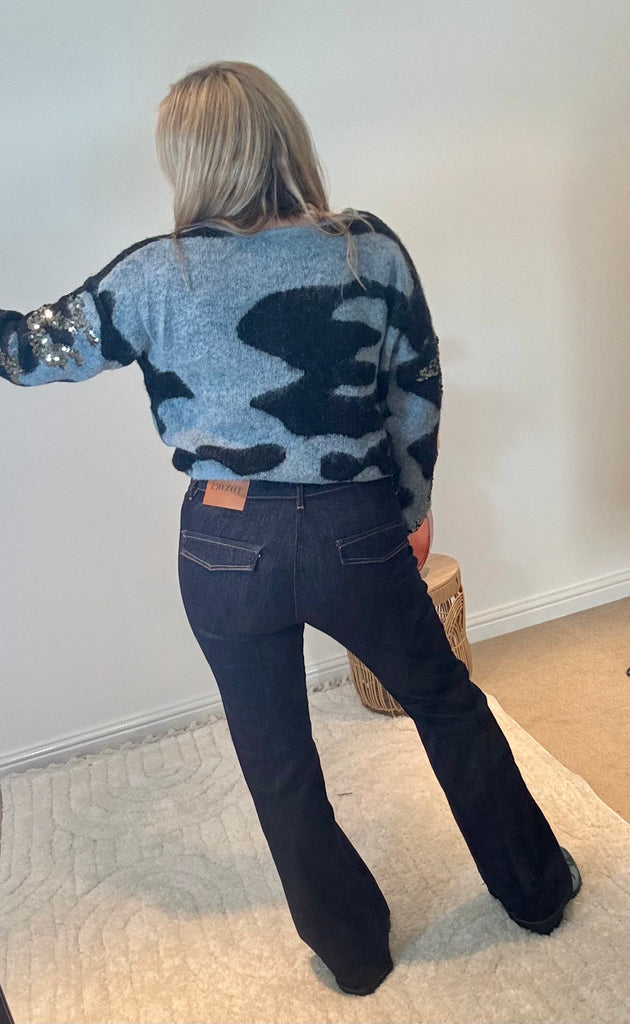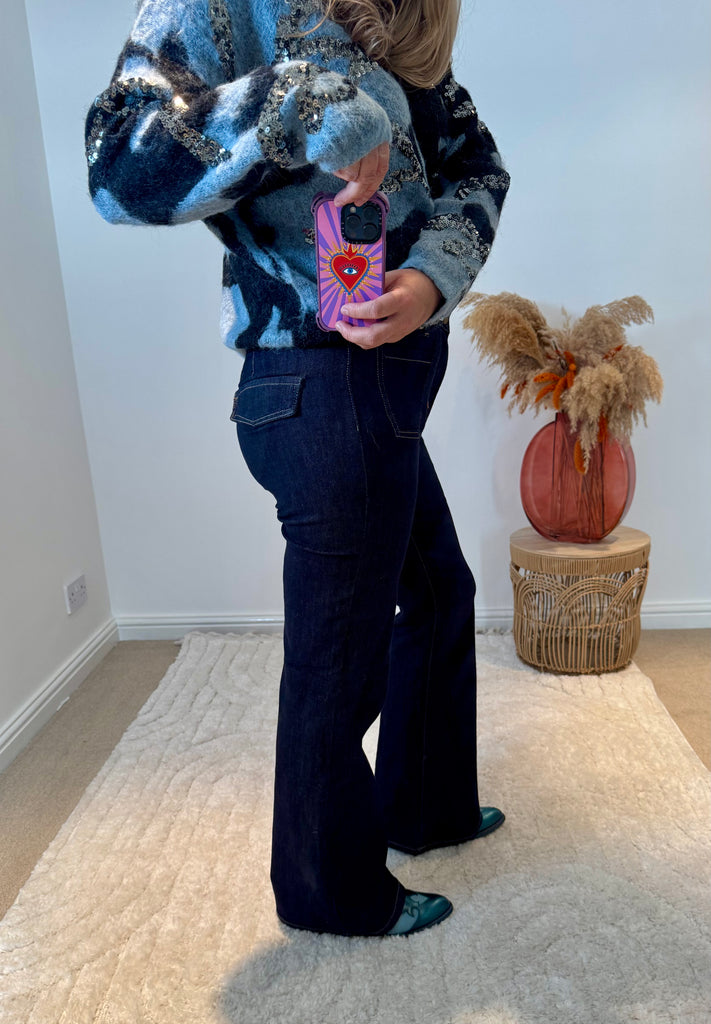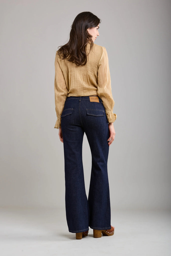 Comfortable jeans with a flared cut that elongates the silhouette. Ideal for a casual and feminine look.